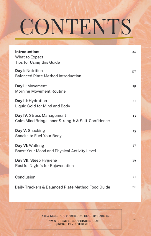 Welcome to Brightly Nourished's 7-Day Kickstart Guide! This free guide is designed to help you build healthy habits that will transform your life. Over the next seven days, you'll discover simple, actionable steps to improve your nutrition, boost your physical activity, manage stress, and enhance your sleep.