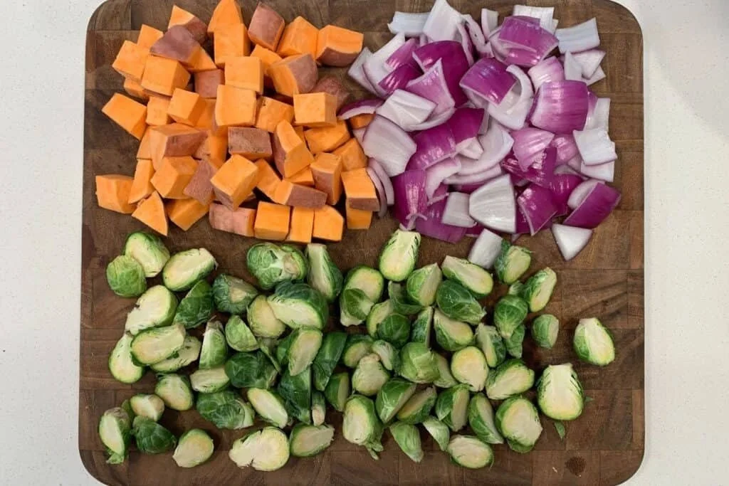 Toss sweet potato cubes, Brussels sprouts, and red onion slices separately with a light drizzle of olive oil, salt, and pepper.